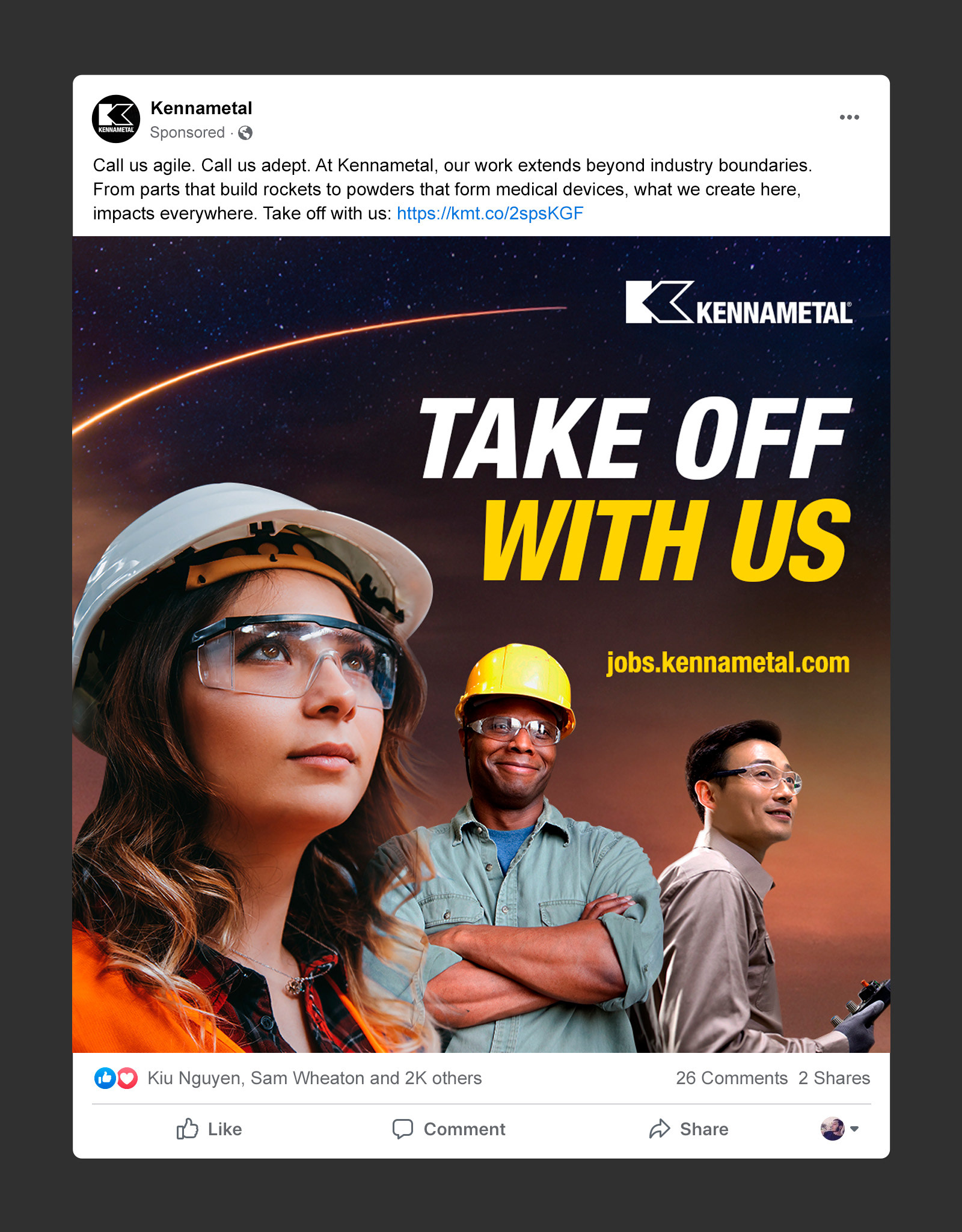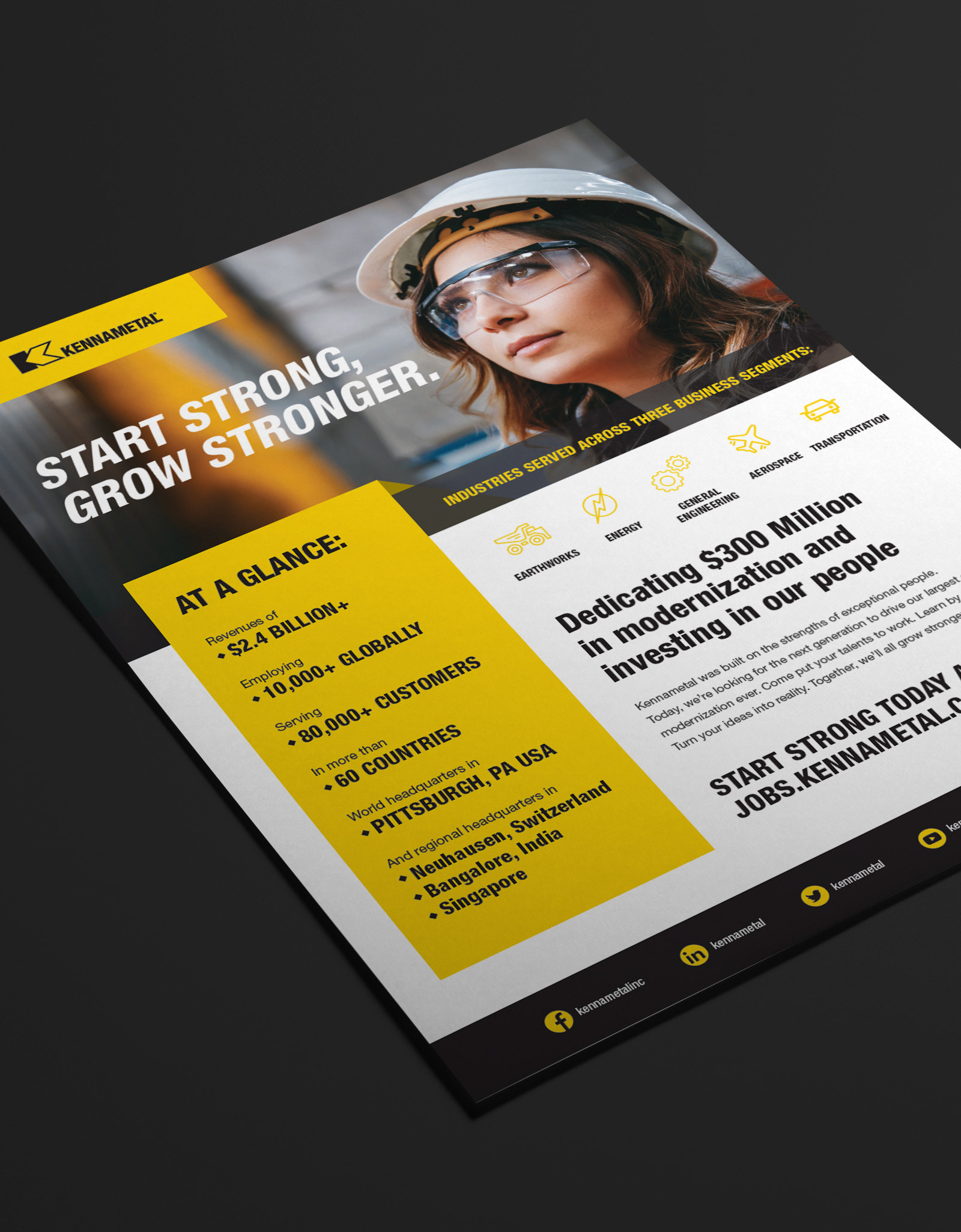 Kennametal needed my team to elevate their social media and print recruitment material to depict the skill and innovation of their people and invite diverse candidates to be part of a team solving how everyday life is built.