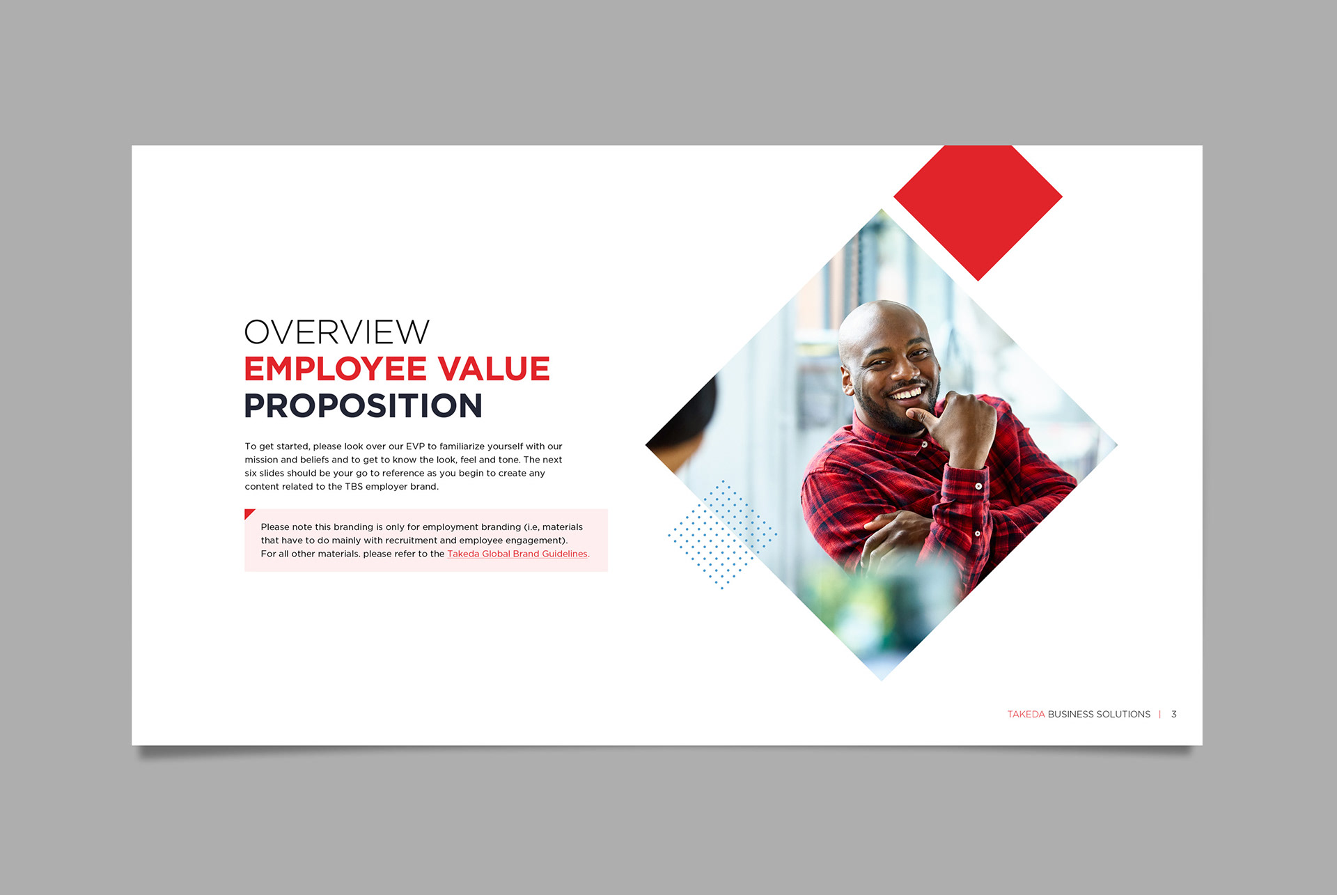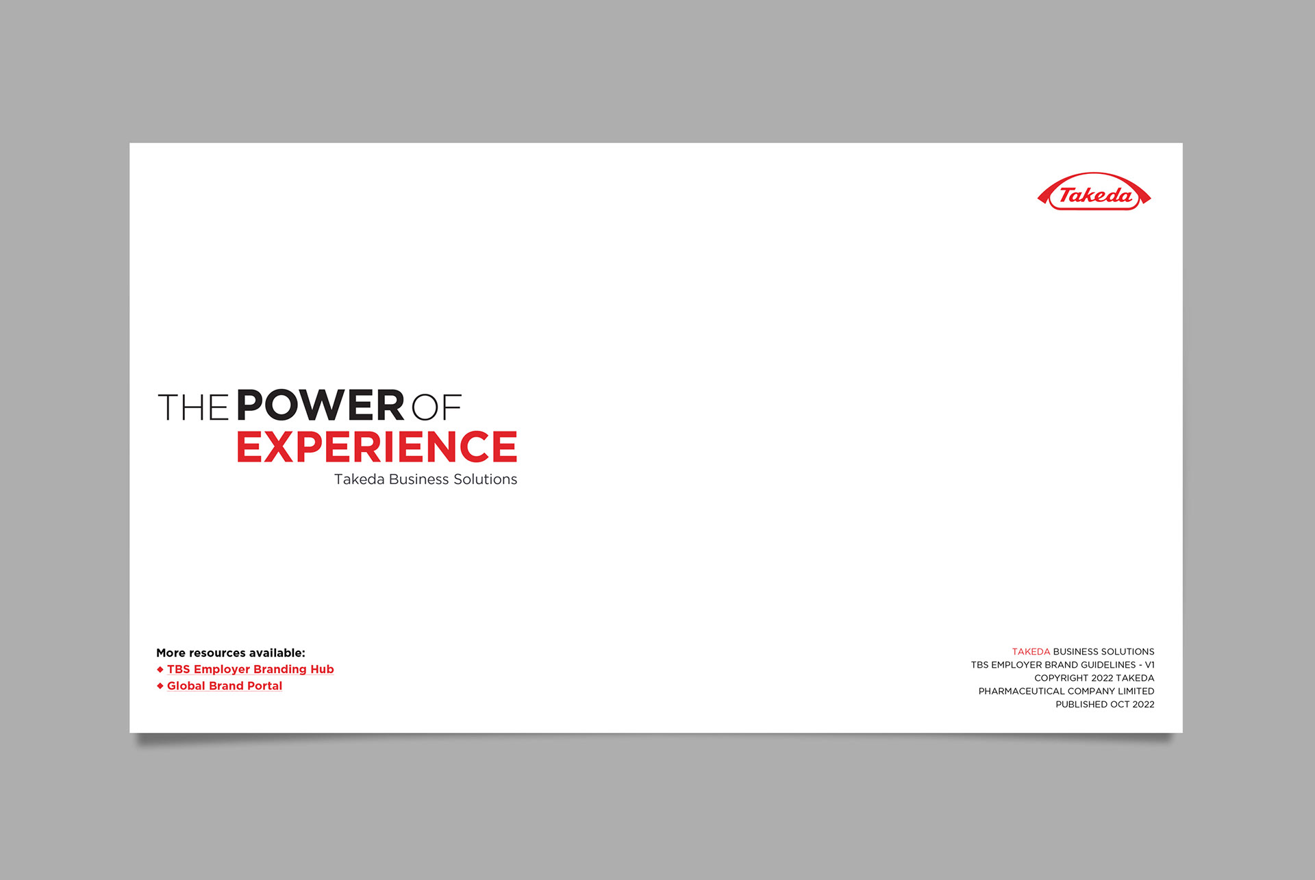 Takeda Business Solutions (TBS) is a shared services arm within Takeda that partnered with IBM with to create a refreshed look for their Employer Value Proposition. It needed to appeal to a younger demographic and highlight their dynamic culture. In addition, TBS wanted to emphasize their work impacts the lives of Takeda patients globally. I developed a concept that used angled boxes to represent the positive and forward-thinking workplace that TBS has created and used bold colors to make the new EVP slogan “Power of Experience” really feel powerful.